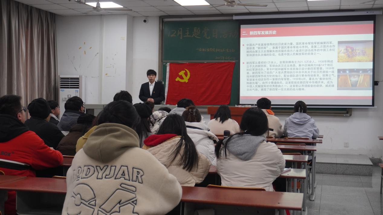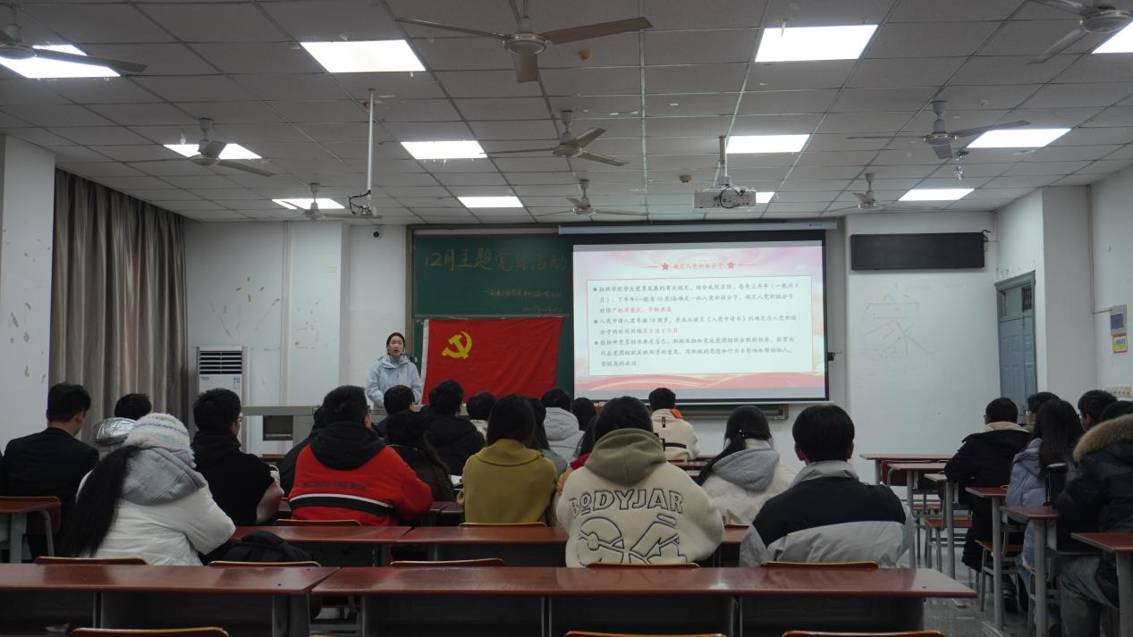 (通讯员 高颖)为传承红色基因,赓续红色血脉,继承和发扬革命传统,回顾和重温党的光辉历程,增强学生党员的荣誉感和使命感,12月20日中午,本科生第一党支部在武教A-107开展12月主题党日活动。