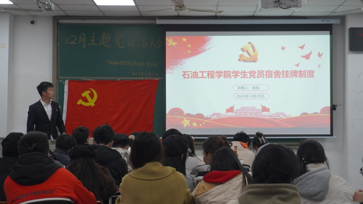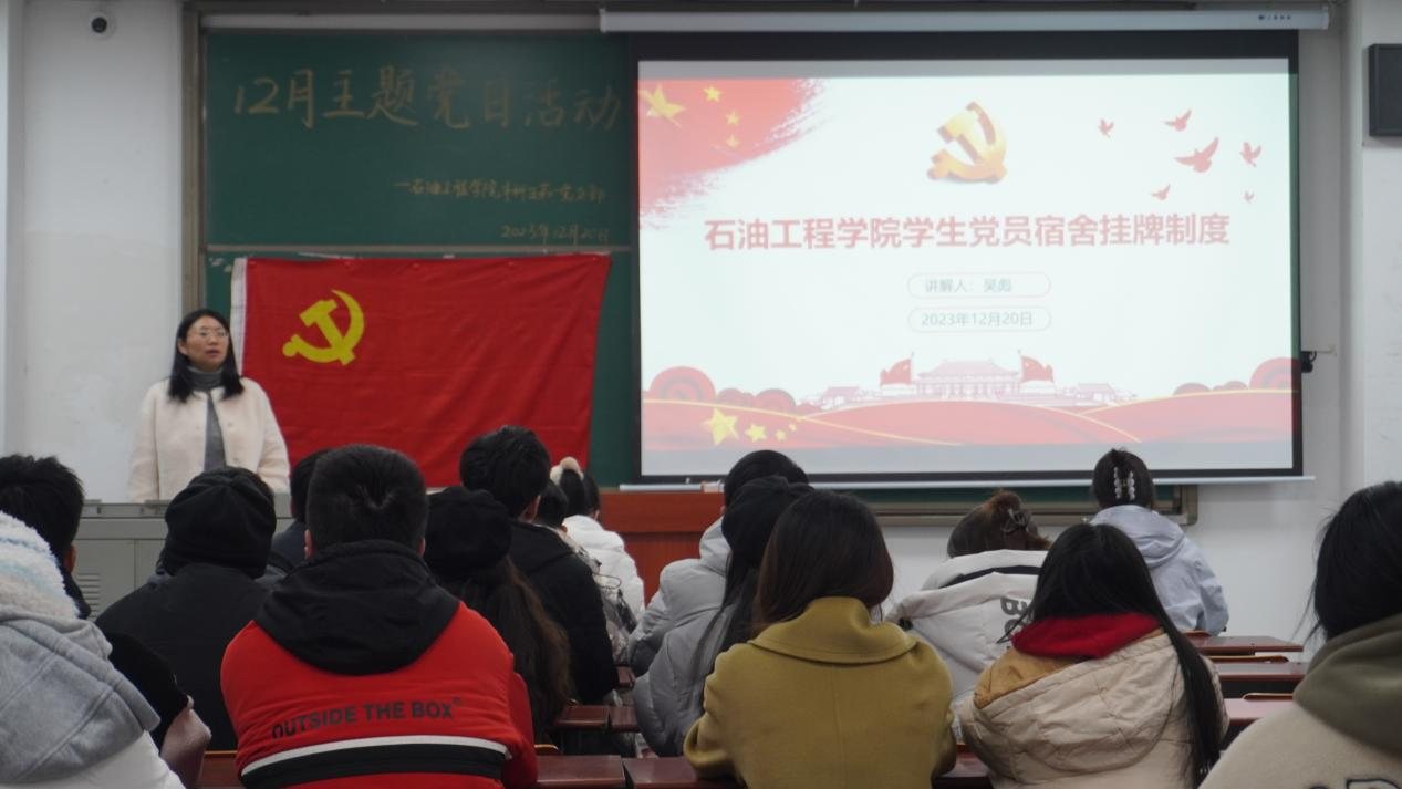 依据《中国共产党章程》,顾小青同志围绕“坚持标准、保证质量、改善结构、慎重发展”四个方面,详细介绍了永利学生党员发展条例。吴彪同志讲解了永利学生党员宿舍挂牌制度,他号召党员同志要以身作则,带头遵守宿舍规定,营造良好的学习生活环境,进一步增强学生党员的身份意识、责任意识、纪律意识、宗旨意识,真正实现“一名学生党员,一面先锋旗帜”的目标。