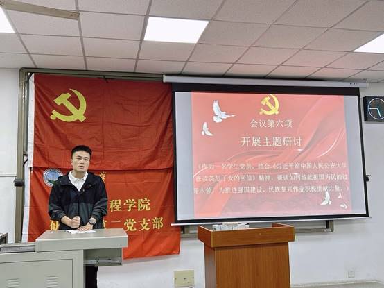 芮烁同志带领全体党员重温入党誓词;初志泓同志带领全体党员集体诵读学习《中国共产党章程》第八章相关内容,开展理论学习和主题研讨:结合《习近平给中国人民公安大学在读英烈子女的回信》精神,关于如何练就报国为民的过硬本领,为推进强国建设、民族复兴伟业积极贡献力量这一主题,吴晓卫同志提出:“我们应以‘理想信念坚如铁’的定力补钙铸魂,始终牢记自己的第一身份是党员,在任何情况下都做到政治信仰不变、政治立场不移、政治方向不偏,为推进强国建设、民族复兴伟业积极贡献力量。”
