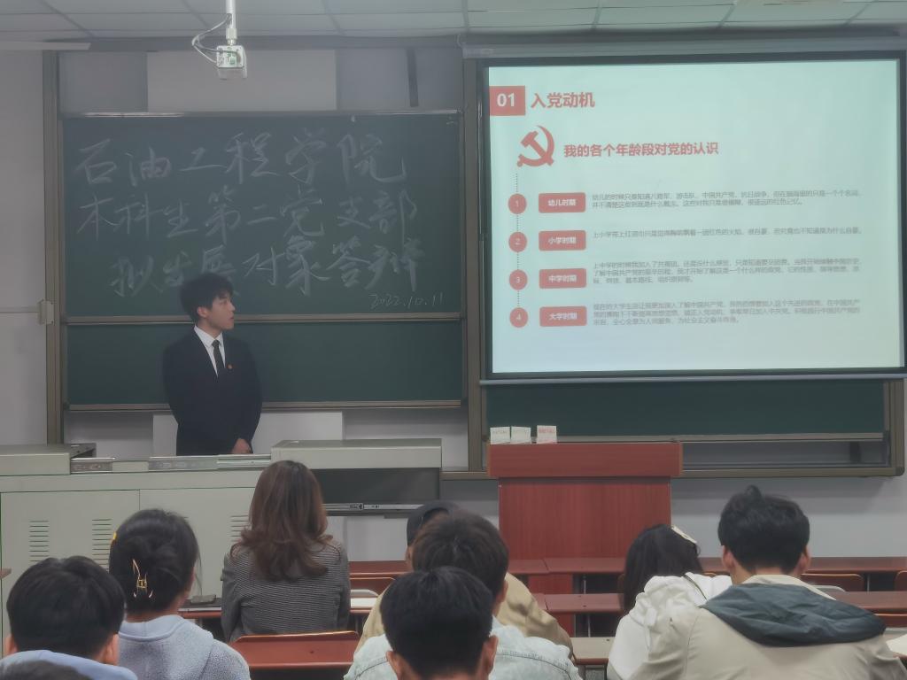 本次答辩会通过个人演讲形式来展现个人风貌。李怡华等十六名同志以“喜迎二十大,奋斗新时代”为主题进行了答辩,对个人情况、入党动机作出了阐释,结合“奋斗新时代”进行了深刻的自我剖析,并以剖析出的自身问题对自己的大学生涯作出了进一步的合理规划。