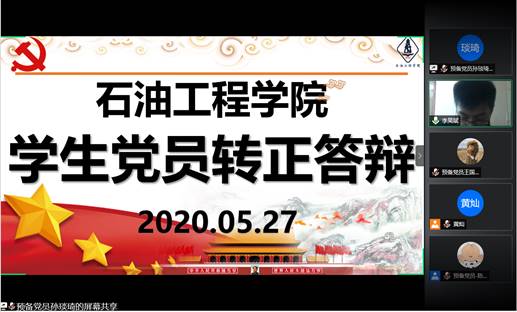 (通讯员王兴义)05月27日下午4时许,永利3044集团官网学生党员转正大会于腾讯会议如期召开。油工院党委副书记刘娥老师、学工办黄灿老师、郭冀宁老师出席了本次大会。参加此次大会的还有油工院本科生党支部、研究生党支部全体党员、预备党员。