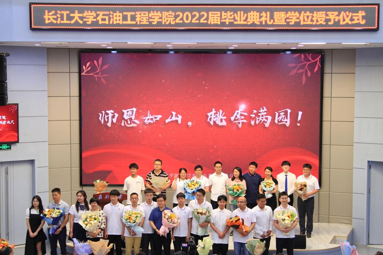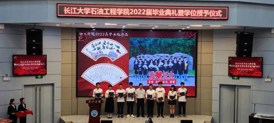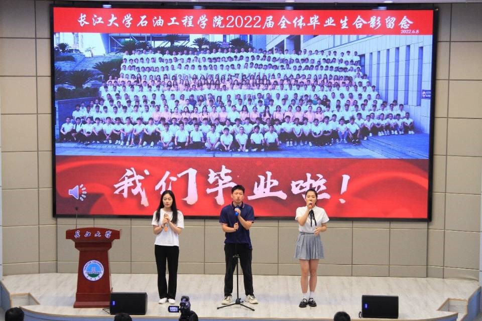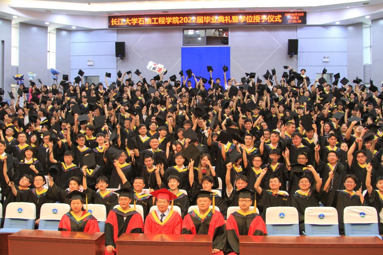 毕业典礼在大合唱《江汉石油之歌》中落下帷幕。2018年的初秋,你们乘风破浪踏歌而来;2022年的盛夏,你们雄心壮志学成出师。知音湖水永远碧波荡漾,进喜路旁永远绿意盎然,A教B教永远书声琅琅。祝福全体毕业生毕业快乐,前程似锦!欢迎大家常回母校看看!