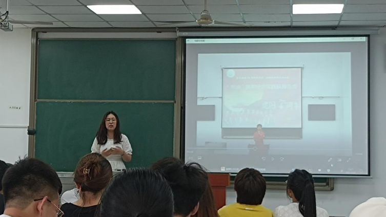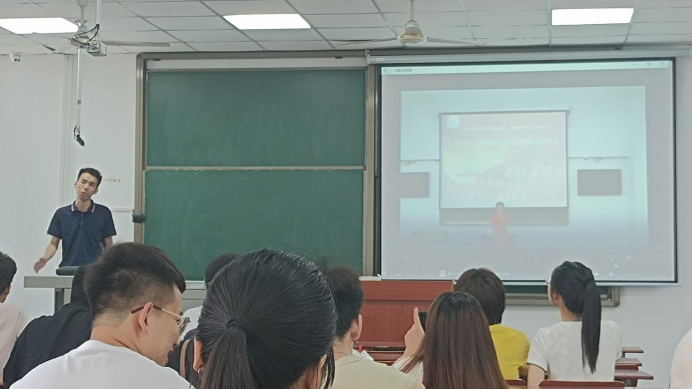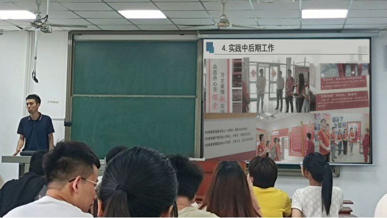 图为沈伟正老师播放往届“黑油”实践队风采视频。通讯员 陈星雨 摄。