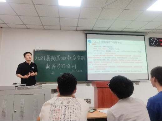 组织系列培训,统筹详细计划。随后,队长陈金建为队员们进行系列培训。他强调,这一系列培训活动的目的是培养队员们有意识的、自主的写作能力,逐步形成写作意识,这需要队员们思想上继续提高,在行动上不断落实、练习,有效地将自身对此次实践活动的所闻、所感、所想用最真实的声音传递给身边的同学,让他们了解老一辈石油人“学石油,爱石油,献身石油”的革命精神,学习“铁人”王进喜“宁可少活二十年,拼命也要拿下大油田”的钢铁意志。接着围绕什么是新闻稿、如何写三下乡新闻稿、三下乡新闻稿写作中的常见问题等方面展开讲解。最后他讲到:“前往新疆之旅是艰辛、磨人的一个过程,但在辛苦之余我们将会收获更多。实地拜访油田现场、点对点采访石油工人、现场观看油田开采等等活动,相信各位队员们在自身职业发展规划上,有新的见地。”