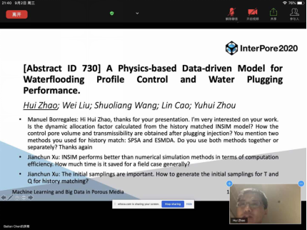 8月31日-9月4日,国际多孔介质协会(International Society for Porous Media)第12届全球年会(Interpore 2020)在线上举办。该会议国际多孔介质协会主办,中国石油大学(华东)承办。永利赵辉教授受邀参加会议并担任大会分会场主持人。会上,赵辉教授发表题为“A Physics-based Data-driven Model for Waterflooding Profile Control and Water Plugging Performance”的大会报告,引发与会专家的热烈讨论与好评。近年来,赵辉教授团队的研究成果在智能油气藏领域的影响日益深入,受到了国际同行的高度关注与认可。本届大会上,挪威SINTEF公司Manuel Borregales等人的大会报告中将其创立的数据驱动模拟模型(INSIM)引入到目前世界石油领域著名的开源油藏数值模拟仿真软件MATLAB Reservoir Simulation Toolbox(MRST)中,该软件被国内外广大石油高校和石油公司广泛采用,用于教学、科研和快速原型开发研究。