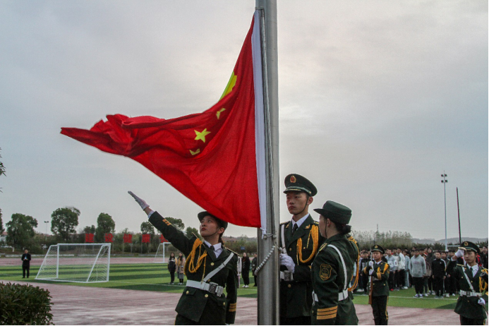 7时整,伴着《歌唱祖国》的旋律,国旗护卫队迈着坚毅而又整齐的步伐,缓缓将国旗送入会场中央。在全体师生洪亮的国歌声中,鲜艳的五星红旗迎着晨光冉冉升起。