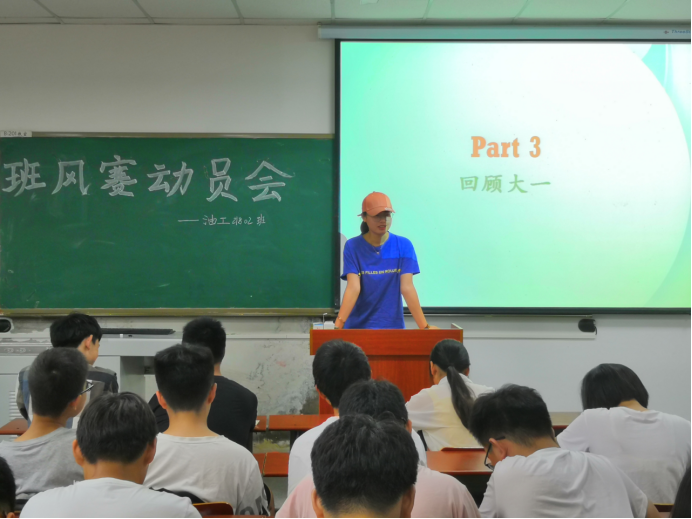 本次班会的一个重要部分便是班级风采大赛的宣传和动员。班级风采大赛,展现班级风采,为了让班上同学能够详细地了解班风赛的比赛流程以及评分细则,班长胥涛首先就班级风采大赛的相关细则向同学们做了介绍,包括班级的制度建设、班会班旗和班歌的的设计以及班级自主开展活动的情况等方面,让同学们对班风赛有了进一步的了解。他呼吁班上同学:“班级风采大赛是向全院展现油工2班风采的大好机会,我们应该认真对待,无论是班委还是其他同学都要参与其中,贡献力量,争取取得优秀的成绩!”