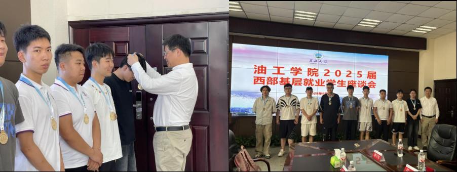 “金驼勋章承使命,谆谆期许启新程”交流结束后,各位老师为学子送上临别祝福并且共同为毕业生佩戴了象征坚韧奉献的“金骆驼纪念章”。张严老师勉励学子:“选择西部就是选择时代责任,望大家将个人成长融入国家战略,在戈壁荒漠中书写新时代青年的答卷。”张昊副书记在总结中强调:“望你们传承石油人‘苦干实干’精神,在基层锤炼本领,以科技力量赋能西部能源发展,母校永远是坚强后盾!今天的你们以母校为荣,明天的母校以你们为傲!”