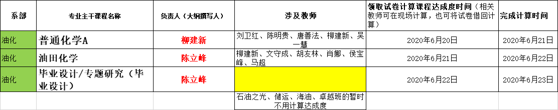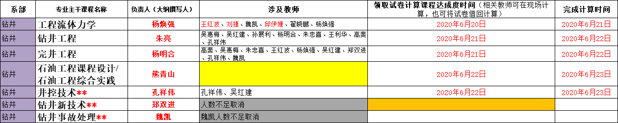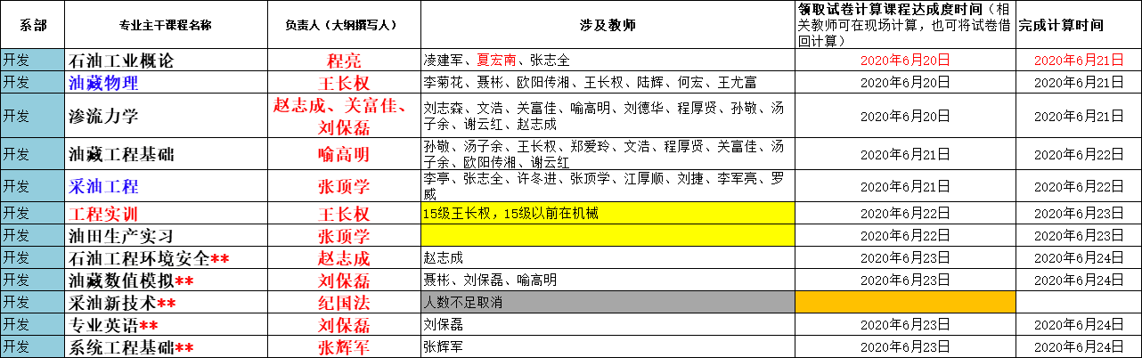根据2020年6月16日专业认证推进会会议决定,永利石油工程专业19门课程的达成度计算由相关课程任课教师负责,各系主任(钻井系熊青山教授、开发系张顶学教授、油化系付美龙教授)负责落实安排具体完成教师,完成达成度计算的截止时间为6月24日。相关课程、课程大纲撰写人、授课教师名单、领取试卷时间安排等见附件。
