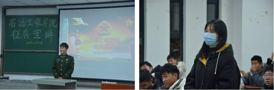 在互动环节,现场气氛热烈、同学们热情高涨,积极进行交流互动,宣讲员黄少栋为大家一一详细解答,并根据自身经历为同学们算了一笔“政治账”“前途账”“经济账”,让同学们更加直观地看到了大学生当兵的巨大优势,并再次鼓励同学们积极投身军营,在军营中锤炼自己,为自己的青春画上浓墨重彩的一笔!