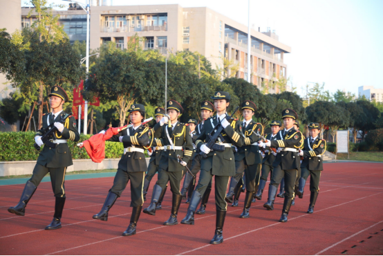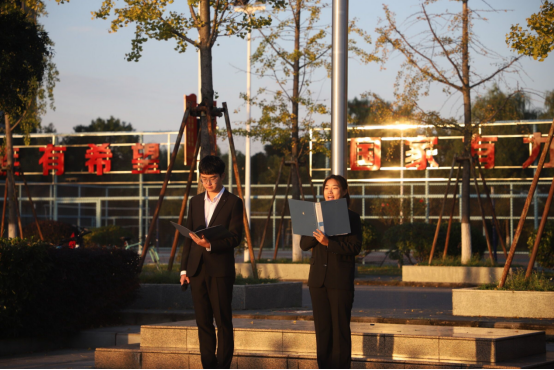 7时整,伴随着《迎宾进行曲》响起,精神抖擞的国旗护卫队迈着整齐、坚毅的步伐缓缓走向国旗台下,庄严的五星红旗在慷慨激昂的国歌声中冉冉升起,全体人员行注目礼。
