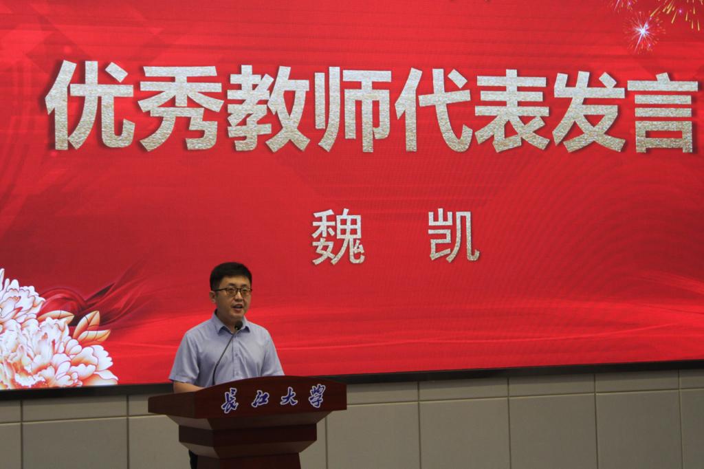 优秀教师代表魏凯副教授分享了学习习近平总书记在考察胜利油田时的讲话精神,“能源的饭碗必须端在我们自己手里”,他激励同学们:作为长大人,应该秉持求实、进取、创业、报国的校风,切实扛起能源报国之责任,诚信立身,精勤为学,努力成为可堪大用、能担重任的新时代铁人。