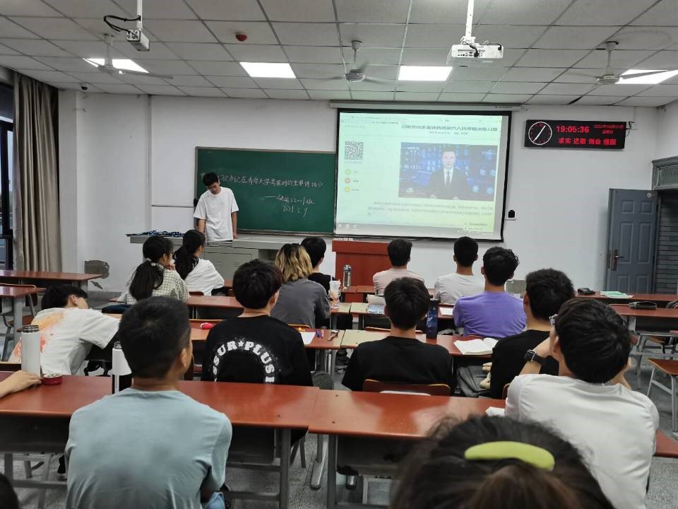 在储运22002班的班会上,班长陈佳同学为同学们播放了习近平总书记在清华大学考察时的视频。习近平总书记在考察时发表的重要讲话中提到,“广大青年要肩负历史使命,坚定前进信心,立大志、明大德、成大才、担大任,努力成为堪当民族复兴重任的时代新人,让青春在为祖国、为民族、为人民、为人类的不懈奋斗中绽放绚丽之花。”他还提出:“要培养一流人才方阵、要构建一流大学体系、要提升原始创新能力、要坚持开放合作”谆谆话语,语重心长,习近平总书记的话如同一个火把,点亮了同学们对奉献祖国、投身祖国建设事业的理想与信念。
