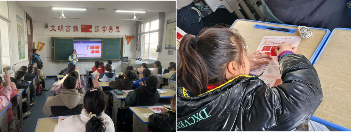 他们首先向学生们展示了国旗、队旗、党旗、军旗、团旗的图片并讲解其相关历史意义。在互动问答环节中,学生们积极参与,展现了自己对五面旗帜的理解。通过阐释国旗作为国家尊严与荣耀的象征、队旗对少年成长的引领作用、党旗承载的党的历史使命、军旗展现的军队责任担当以及团旗汇聚的青年力量,志愿者们进一步加深了孩子们对旗帜的认识与理解,并鼓励他们要像旗帜一样,坚定信念、勇往直前。