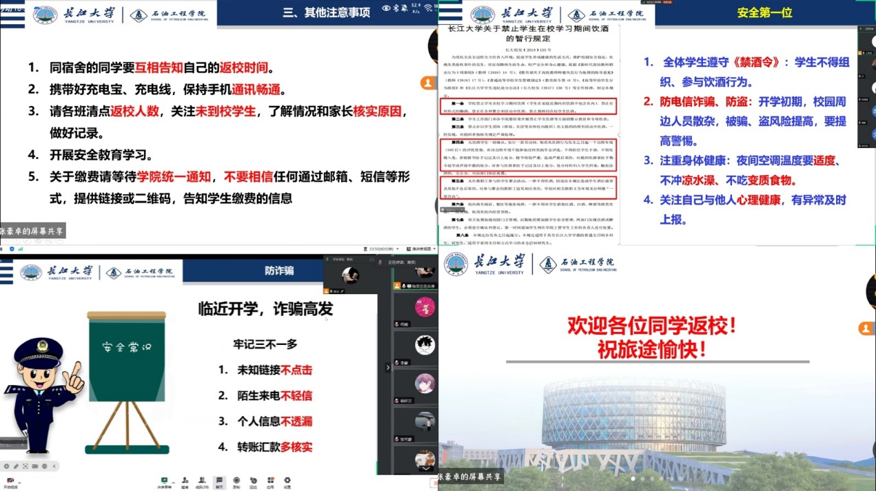 本次主题班会由新生辅导员、研究生辅导员以及各班班主任主持,主要从新生入学安排以及返校安全教育等方面进行了重点说明。首先老师们再次强调了开学时间,提醒同学们提前买票;对于即将入学的新生,年级辅导员为他们讲解了线上报到流程及注意事项,为新生顺利报道保驾护航。同时着重强调了安全教育学习,从消防、交通、人身、财产安全以及防诈骗、溺水、校园欺凌、毒品等多个方面展开讲解,并通过列举相关案例为同学们提供多条防诈骗技巧等,并再次告诫同学们不得组织、参与饮酒行为,从多个方面为学生的安全提供保障。