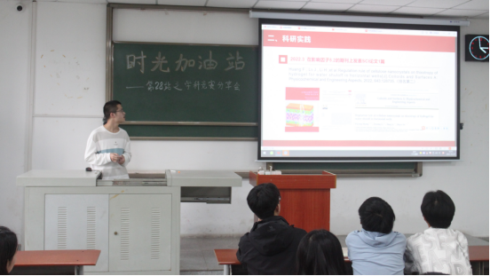 曾先后获得2023年挑战杯全国铜奖、2023年挑战杯湖北省一等奖、2023年“互联网+”湖北省复赛金奖等奖励的王范同学针对“挑战杯”从团队组建、对外交流、高效备赛、自身收获几个方面,细致入微地为同学们分享了自己参加挑战杯的经验。同时他鼓励大家要学会坚持:“刚进入团队或实验室难免会从最枯燥的东西做起,请坚持下去;难免会有挫折会有痛苦,也请坚持下去。虽然我们现有的思路或想法可能不够成熟,但我相信在不久的将来,一定可以通过自己的努力,为祖国的能源行业的发展贡献自己的力量。”