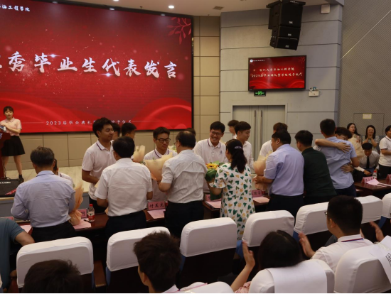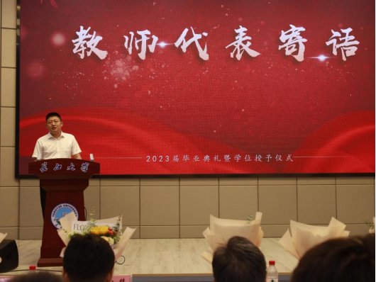 仪式第六项,教师代表寄语。临别依依,言语万千。教师代表许冬进老师对毕业生提出三点希望:第一要步履不停、坚持奋斗;第二是虚心不断学习,只有做好人,方能干大事;第三要永怀敬畏感恩之情。“当你们事业有成,不要忘了向学院报喜,你们是我们的骄傲;当你们遇到困境和挫折,我们是你们的坚强后盾,我们愿意协助你们一起渡过难关,以后记得常回家看看,我们美丽的知音湖畔静候佳音。”