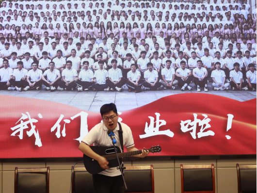 仪式第七项,以歌告别。毕业生代表徐童、肖邦彦、田靖彤、王同兵、叶志沾带来毕业歌曲串烧以及毕业年级辅导员郭冀宁老师吉他弹唱《再见》将典礼现场气氛再次推向高潮。