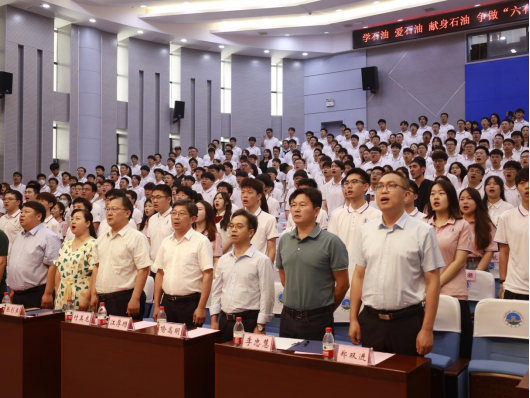 仪式第一项,合唱国歌与院歌。“迎着红日,迎着长江,今天会合江汉,明天开上石油战场……”典礼在师生齐唱国歌与《江汉石油之歌》中拉开帷幕,嘹亮的歌声表达了全体师生对献身祖国与石油事业的爱国情怀与理想信念。