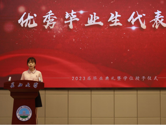 仪式第五项,优秀毕业生代表发言。“今天是一个收获的日子,也是离别再起航的日子,我们将踏上人生另一个全新的征程……”田靖彤向全体毕业生提议:一是做“六有”青年,明智;二是脚踏实地,实干;三要创新进取,有为;四要回报母校,感恩。“因为在长大,我们才有幸汲取老师们博采众长的理论和锐意进取的精神,也是在这里了我们才能成为更好的自己,我们要心怀感恩在各自的岗位上发光发热。”最后,她代表全体毕业生祝愿母校早日实现双一流建设大业,祝母院年年桃李、岁岁芬芳,一流学科建设再创辉煌。