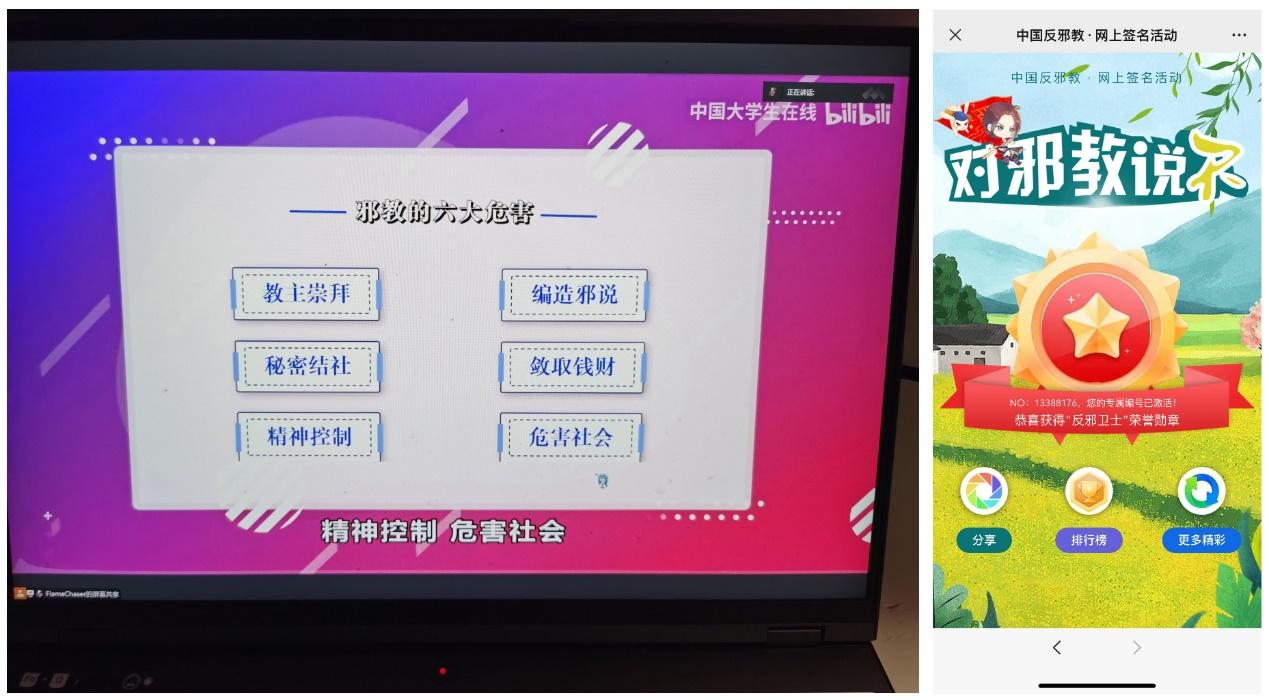 各班同时组织学生关注“中国反邪教”微信公众号,开展“对邪教说不”网上签名活动,积极参与线上警示教育项目,观看警示教育宣传片,加深学生对邪教特征和危害的认识,提高学生防范邪教意识和能力。看完警示教育宣传片的同学纷纷表示,要从自身做起,坚决对邪教说不,树立正确的思想观念,增强防范意识,对邪教歪理邪说做到不听、不信、不传。