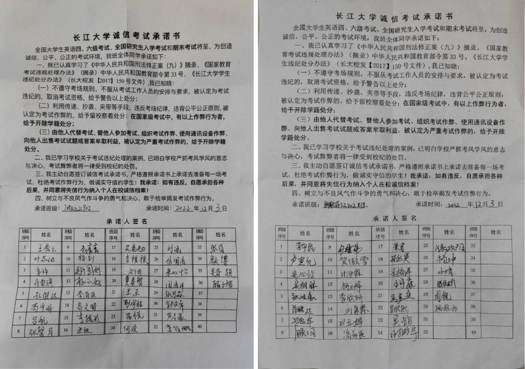 承诺诚信考试,规范学生诚信考试纪律。结合学校文件,学院统一制作《诚信考试承诺书》,所有学生认真阅读了诚信考试承诺书,自觉践行诚信考试承诺,杜绝违规违纪行为的发生。