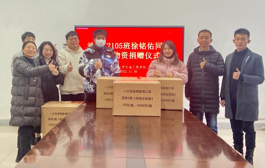 刘娥代表学院接受捐赠物资并对徐铭佑对学院疫情防控工作做出的积极贡献表示感谢。一只只口罩,是徐铭佑对油工学院的深情回馈,是油工感恩文化的传承,更是油工精神的传承。