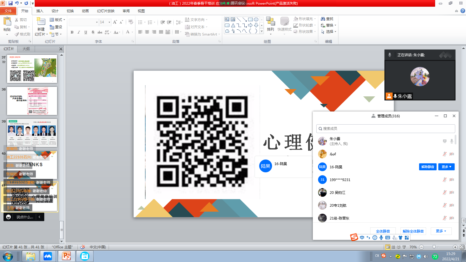 此外,朱老师还要求学生干部守好自己的责任田,做优秀的心灵捕手,与同学们接触时留心留意,主动发现、及时上报。最后,朱老师为同学们介绍了学校心理健康教育体系,重点解读了武汉校区心理健康教育资源、心理咨询服务流程以及联系方式。