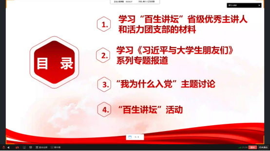 学习《习近平与大学生朋友们》系列专题报道。团支书代表孙琰琦向大家介绍了这一系列专题报道的背景——习近平总书记在基层工作时与一些大学生进行交流并对他们后来的人生产生重大影响的一些事迹,这些事迹不仅可以帮助我们更好地了解习近平总书记的为人处世及他的思想,更有助于我们青年大学生价值观和人生观的形成。孙琰琦向大家列举了文章中主持人问的几个比较经典的问题,希望大家能从中学有所获:如何尽快甩掉书生气,尽快适应社会,缩短大学生在基层单位的适应时间;您当时还是一名在校学生,请问这次活动对您后来的学习、择业、创业产生了哪些影响;请谈谈您对习近平同志“勤俭持家,低调做人”的家风的感受。在大家看完这些问题的回答后,有感动、有惊讶、有激动但更多的是深思,思考自己该如何做一名合格的当代大学生、当代青年。
