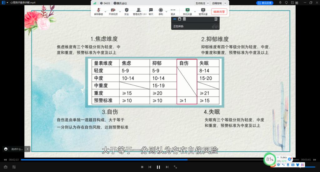 培训伊始,全体参会人员集中学习了《心理测评量表讲解》和《谈心谈话培训》两个视频文件,随后,心理专干朱小露向老师们讲解了大学生心理危机识别及谈心谈话技巧。朱老师从谈心谈话的目的和意义入手,以理论阐释与案例示范结合的方式围绕“约谈前准备、约谈过程、约谈后工作”三部分展开培训,细致讲解了测评量表的解读、大学生常见心理问题类型与表现、心理危机识别、谈心谈话技巧等内容。她强调,在谈心谈话过程中要注意方式方法,灵活运用谈话技术,深入学生内心,获得学生信任,保护好学生的个人隐私,提升对学生心理危机的敏感性。