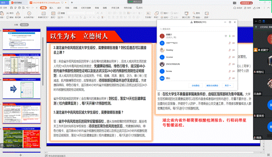 为确保学生安全顺利返校复学,根据学校永利3044集团官网2022年春季开学工作实施方案精神以及武汉校区开学任务安排,近期永利分年级开展线上返校安全教育大会,对返校通知、返校路途安全教育和防范金融诈骗教育做出安排与强调。