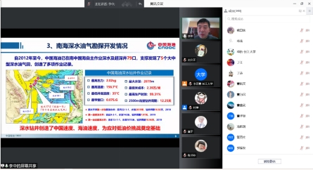 接着,李中教授以我国首个自营深水千亿方大气田—深海一号气田为例,从深海一号气田基本概况、勘探开发历程、技术创新等三个方面介绍了中国海油深水油气钻采技术背景及关键技术,同时也展示了以“复杂地质环境深水开发安全钻井技术”、“边底水气藏安全高效完井及流动安全保障技术”等为代表地创新成果,李中教授也为同学们指点迷津,指出了深海钻井与陆上钻井的区别以及难点,详细介绍了未来技术需求及挑战,对关键技术发展进行了展望,并鼓励同学们努力学习专业知识,积极向上,成为有责任有担当的新时代人才。