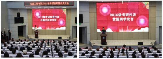 2017级考研优秀代表石康立同学分享了他的考研心得:准确掌握考研信息,科学制定复习计划;均衡各科复习,力求补短板;保持积极心态,坚持计划,行百里者半九十。油工(中俄)21801班黄盟同学代表全体2018级本科生表明决心,呼吁大家一起勇敢追梦,“一切目标最终达成的源头,都始于自己心中的那团‘火’,也就是我们惯常所称的‘决心’。我相信,当大家冒起那团‘星星之火’时,并且持续努力付诸实践践行时,大家就离自己美好的未来不远了。”