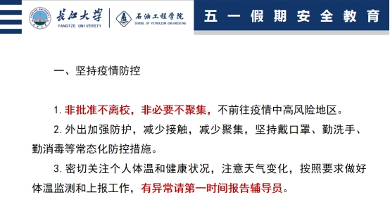在同学们五一假期出行期间,各项安全防护也要做好。具体有:一、坚持做好疫情防控工作,勤洗手、戴口罩、少聚集、与他人保持安全距离;二、做到安全出行,不要乘坐无牌无证的车辆,需让家长知情出行的规划;三、做好宿舍防盗防火工作,在宿舍要随手关门,不要使用大功率电器和明火。四、出行要提防盗窃,注意不要拥挤,以免不法分子实施盗窃。