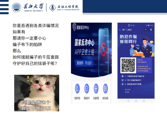 近期,网络诈骗事件频频发生,老师们不断提醒同学们“要提防网络诈骗,不要转账是关键”。并介绍了网络诈骗手法的九大类型:仿冒身份、购物类、活动类、利益诱惑虚拟险情、日常消费、钓鱼木马、提供特殊服务以及其他新型网络诈骗手法。总之,无论是什么类型的诈骗,不要转账是原则。接着,为了提高同学们的防诈骗意识、避免上当受骗,动员大家安装“国家反诈中心”app,并在微信注册“金钟罩”小程序,坚决对网络诈骗说“不”,以切实保障同学们的经济安全。