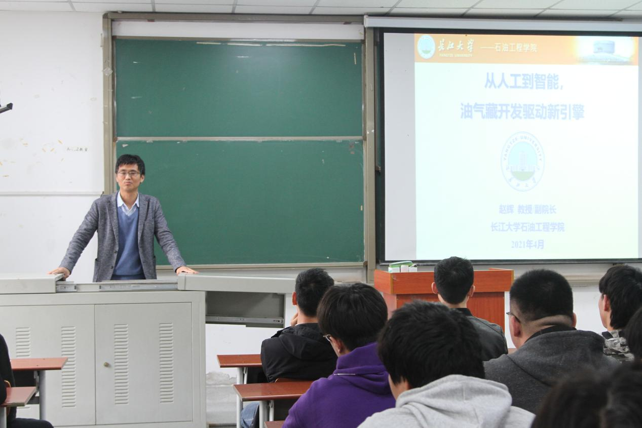 报告中,赵辉老师围绕“智能油藏背景及关键技术”进行探讨,他指出:智能油藏技术是智慧油田建设的关键,号召同学们努力学习专业技术,提高其文化素养。在石油行业面临资源枯竭,新能源冲击的大背景下,赵教授给予我们信心,他认为:油气仍是全球能源消费的主体,同时需要从事专业的年轻人坚持下来,推动油田智能化转型。增强了同学的自信心和使命感。
