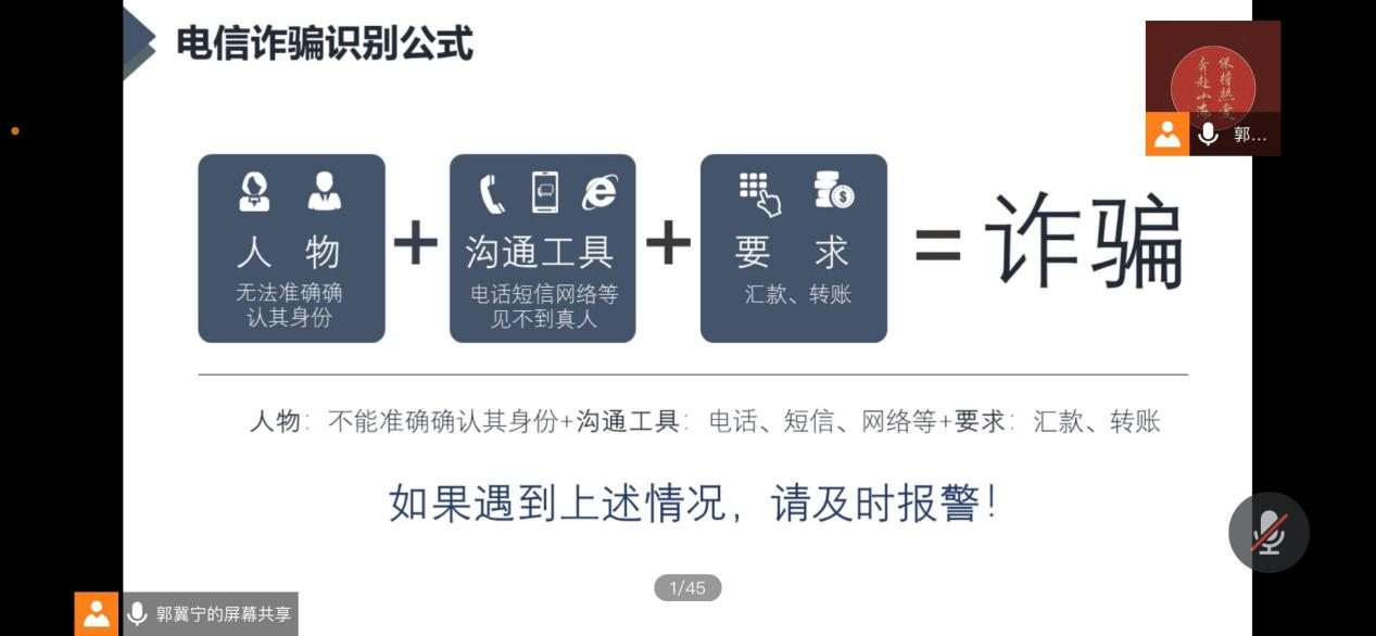 在电话会议中老师及民警们还教同学们一个电信诈骗识别的公式:在人物无法确认其身份、电话短信网络见不到真人且要求汇款转账的,可认定为诈骗。同学们若遇到上述情况,请及时报警!