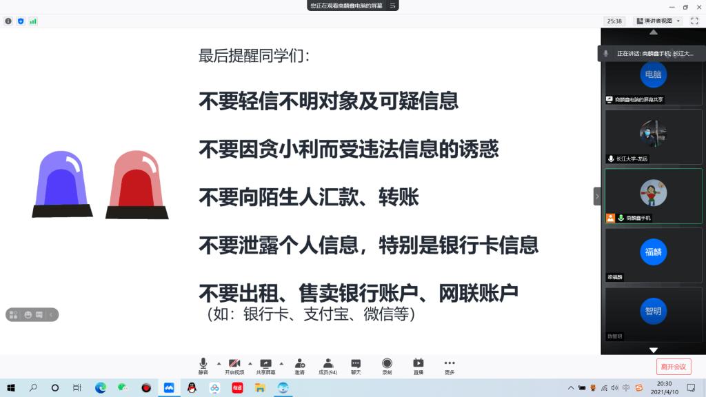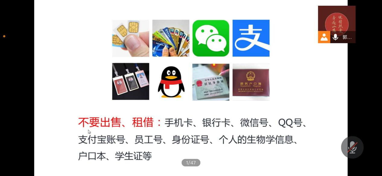 在会议上,老师及民警通过大量大学生遭受电信诈骗的案例,让同学们以此为警示,增强自己的防诈骗意识。希望同学们谨记五个“不要”,即不要亲信不明对象及可疑信息;不要因贪小利而受违法信息的诱惑;不要向陌生汇款、转账;不要泄露个人信息,特别是银行卡信息;不要出租、售卖银行账户、网联账户(如:银行卡、支付宝、微信)。凡是与金钱和个人信息相关的,同学们都应谨慎再谨慎,不要上当受骗!