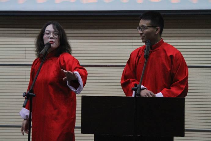 接下来,戴思梦、詹皓宇同学别具一格的《众口难调》展现了相声艺术创新的新浪潮。表演期间,戴思梦同学将观众的掌声比做“叩谢诸仙赐我天雷滚滚”,并用央视频道的节目《动物世界》的解说风格,乘务员的语言风格,以及翻译腔的风格,为大家带来丰富的听觉体验,精彩纷呈,观众们欢笑不断,“天雷滚滚”。吴广杰、仇誉龙同学还表演了《套路趣谈》,提出金句“生活多一点真诚,少一点套路。”两位同学以时下流行的套路情话与观众进行互动,全场气氛十分融洽。压轴节目《疫路有你》歌颂了疫情期间医务工作者和志愿者们恪守岗位、为国为民的精神,刘文杰、祁禹衡同学还通过讲述隔离在家期间发生的种种趣事,赞扬了医务工作者工作的勤劳艰辛以及他们英勇献身的精神。青春战疫,医务工作者们“身着白衣,心有锦缎”,共同守护国泰民安。