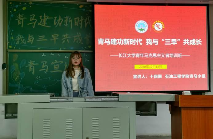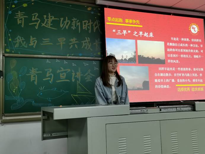 孙萌同学首先播放了一段视频来展现青马班概况和成员风采,视频结束后,宣讲活动正式开始。她首先以“三早”精神是什么来展开讲述,“三早”即早起床、早自习、早锻炼,她在为同学们讲述这“三早”的具体内容的同时,还仔细的讲解了“三早”的好处和意义。她谈到通过开展“三早”活动,学习“三早”精神,青马班的成员们在收获了良好的习惯和健康的生活方式的同时,更提高了学习和工作效率,总而言之,学习“三早”对于同学们的学习和生活都有着一定的帮助。