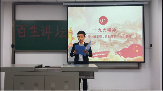 (通讯员 盛威威)2020年10月10日早十时许,油工21904班在武教B-103举行了百生讲坛之优秀主讲人评选活动,活动由康汉博同学主持。本次活动主要展示了油工21904班全体同学学习习近平新时代中国特色社会主义思想和党的十九大精神的成果。