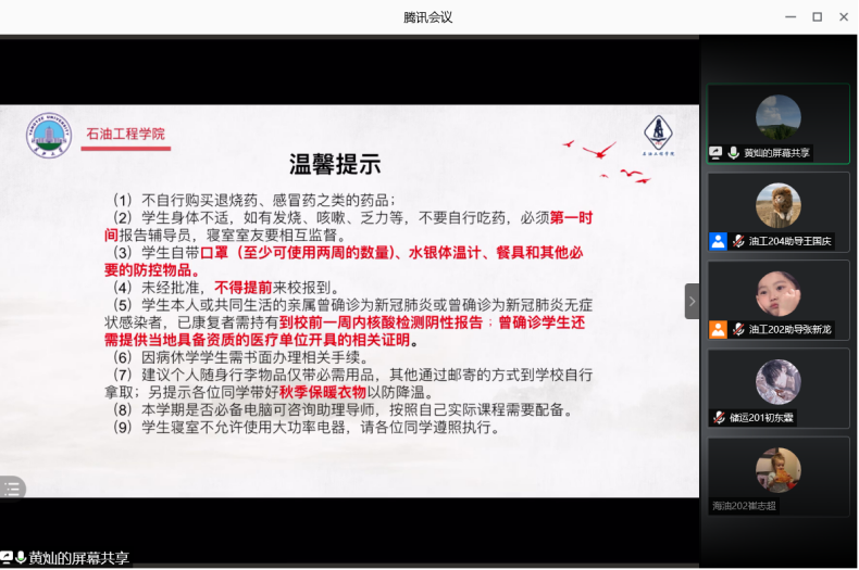 会议第一项,为确保20级新生能顺利按时报到,黄灿老师强调了新生来校前所需要做的准备,在“今日校园”APP上持连续打卡不少于7天和报到“申请—审批”制。会议第二项,黄灿老师向新生讲解了进校的流程,详细说明了迎新的具体时间和地点,特别强调体温检测合格后才能进行办理报到注册手续。而后黄灿老师详细说明了新生入学相关手续办理流程。会议第三项是新生军训方案的介绍,她特别提醒,军训是入学以来的第一门必修课,所有新生必须认真对待、严格落实。