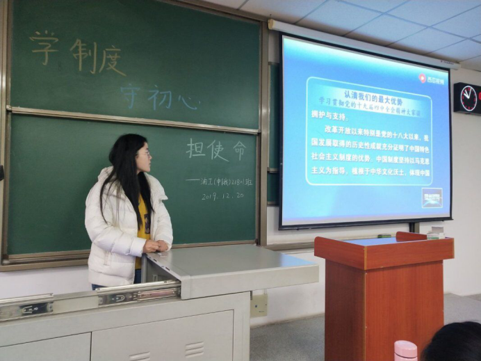 首先同学们一同观看了十九届四中全会召开的新闻,以及以《让四中全会精神更深入人心》为主题的焦点访谈。通过这两个视频以及其他文件,同学们了解到中共十九届四中全会是高举伟大旗帜、应对机遇挑战,进一步团结凝聚全国各族人民共同奋斗的意志,把党和国家事业推向前进的重要会议;是研究部署中国特色社会主义制度建设,进一步推进国家治理体系和治理能力现代化,为实现“两个一百年”奋斗目标的重要会议。