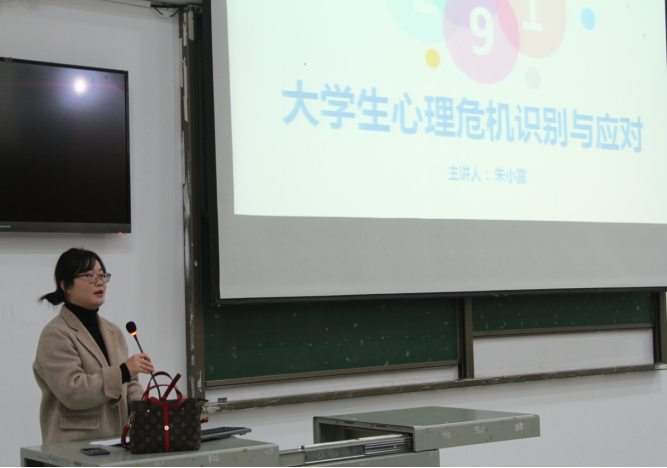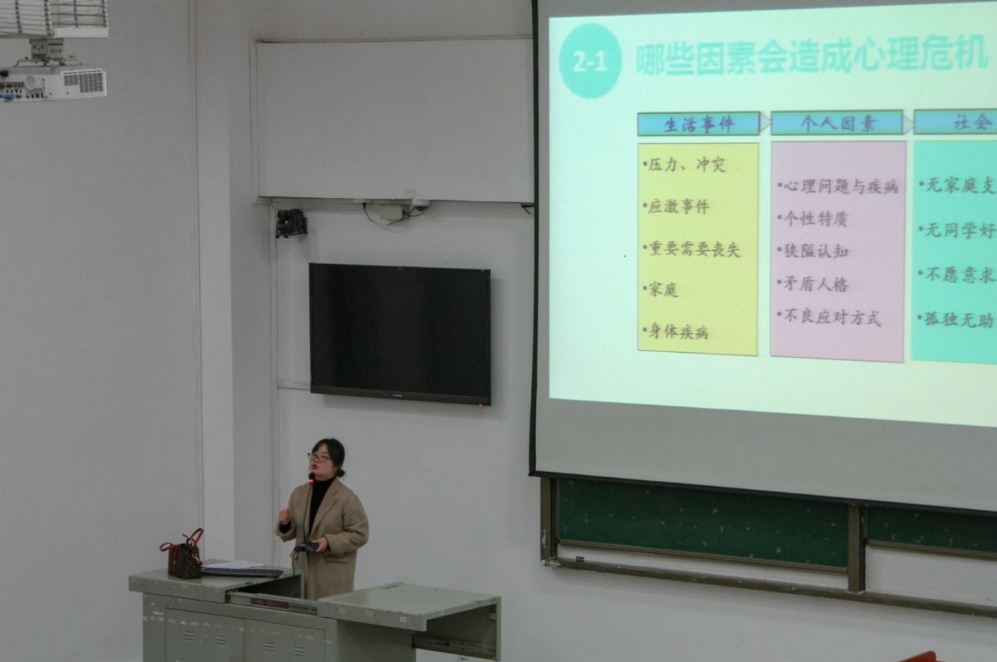 讲解过程中,朱老师同大家谈到:危机即为危险与机遇,危险是严重威胁生活和家庭以及精神崩溃,而机遇便是及时有效干预,防止发展。为了让大家更加透彻地了解到大学生的心理危机,朱老师引用中国科技大学陈蕾的自杀事件为典型案例,详细地讲述了陈蕾自杀前的各种征兆与心理产生问题所表现出来的行为,并且指出最终导致其走向极端的种种原因,引发同学们的深思。