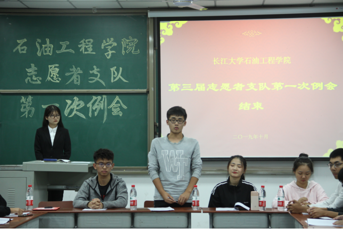 副队长程诗颖对志愿者支队进行介绍。她从志愿者支队考核条例、志愿者支队活动、志愿精神理念三个方面讲解了志愿者支队的工作和责任义务。她讲到,我们志愿者的精神是:志愿性、公益性、组织性、无偿性,大家要坚定自己的目标,做好奉献的准备。志愿者支队队长祝铭池对志愿者活动进行了简要介绍,他介绍到了支队的志愿服务活动主要有废品回收活动、支教活动、医院引导活动等。刘景峰接过话题进行发言,他希望:其一,在座的各位新老干事要承担起自己的责任,要有坚持不懈的毅力;其二,大家要坚持留下来,一起进步、一起成长,将志愿活动办得越来越好。