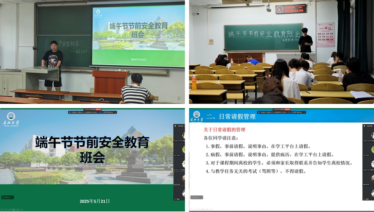 (通讯员 宋昱鑫)为进一步增强同学们的安全防范意识,保障假期安全,做好端午节期间的安全教育管理工作,永利3044集团官网组织全体本科生和研究生召开端午节节前主题班会活动,本次班会旨在向同学们强调各方面的安全注意事项,预防各类安全事故的发生。