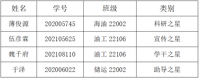 根据学院《关于永利3044集团官网评选2023年“油院之星”的通知》,经学生个人申请、评委团初评、学院会评,拟确定选薄俊源等四名学生获评2023年“油院之星”奖学金。现将评审结果进行公示: