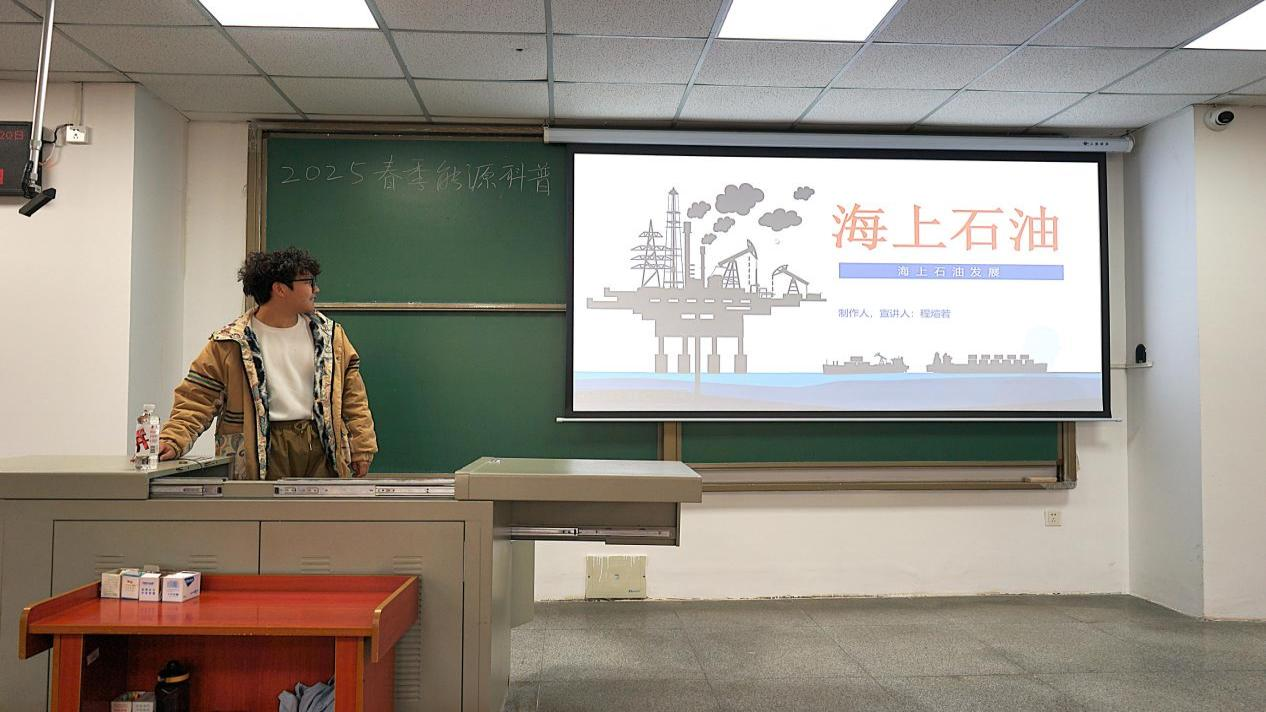 2025年3月20日,永利3044集团官网黑油能源科普宣讲队在B教108开展了主题为“走向深海——中国海洋油气发展之路”的能源科普宣讲活动。主讲人程煊若围绕我国海洋油气开发的历史、技术突破、未来发展方向等多个方面进行了深入讲解。并结合视频演示环节,展示了海底地震勘探技术、钻井平台运作模式以及海上油气田的实际应用案例。同学们纷纷表示,通过此次宣讲,他们对海洋油气的勘探技术、生产模式以及国家能源安全的重要性有了更深刻的认识,希望未来可以为祖国的油气事业贡献自己的一份力量。