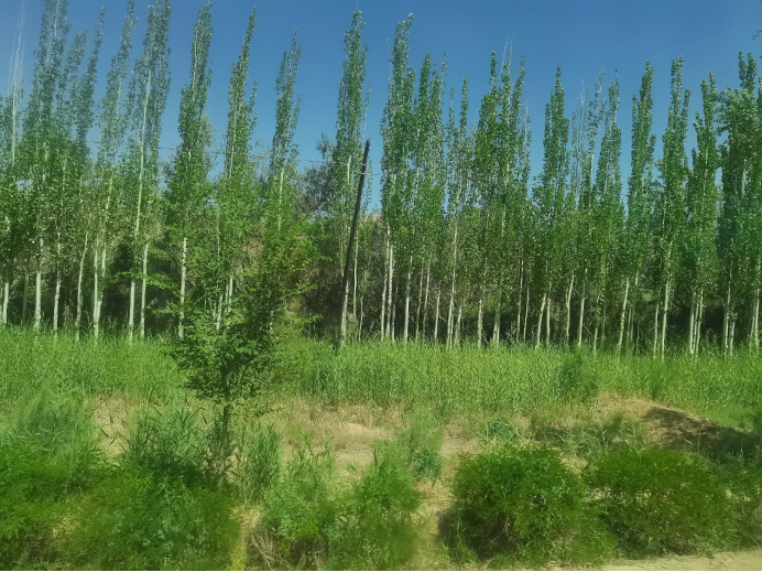 在新疆最大的感触就是,在不被阳光直射的树荫下或遮挡物的下方,就感觉格外凉爽,没有南方夏日的黏腻和闷热,可能是建设完成了塔里木沙漠公路防护林生态工程,种植红柳、梭梭、沙拐枣等防沙固沙植物,形成全长466公里的沙漠“绿色走廊”,绿色植物之间心手相牵,形成了遍地阴凉,创造了人间奇迹。