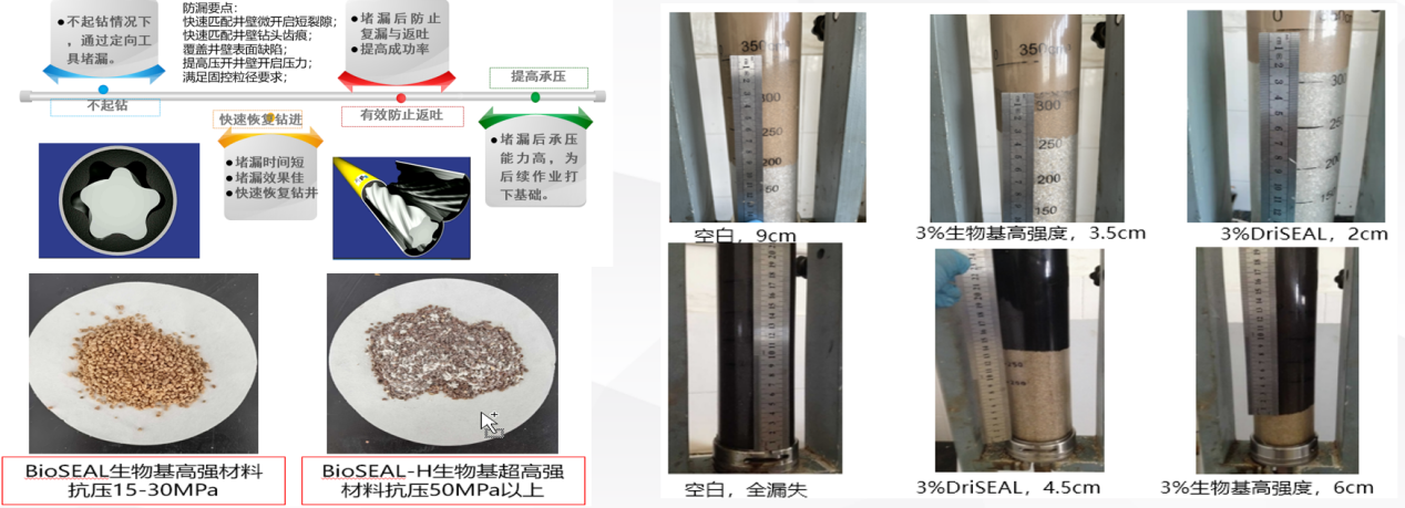 该技术以“刚柔复合+高滤失承压”协同机理为核心:通过弹性石墨等可变形材料与刚性颗粒的复配,实现随钻条件下在裂缝中架桥填充并形成高强度封堵层;同时利用高滤失承压机制,使封堵剂及固相颗粒在压差驱动下快速滤失并聚结成致密堵漏层,有效密封漏失通道。该体系兼具随钻实时防漏与井筒密封完整性修复功能,适用于复杂裂缝型地层与高压高温井筒的长期失返与密封重构场景。